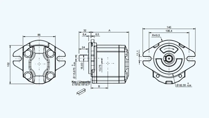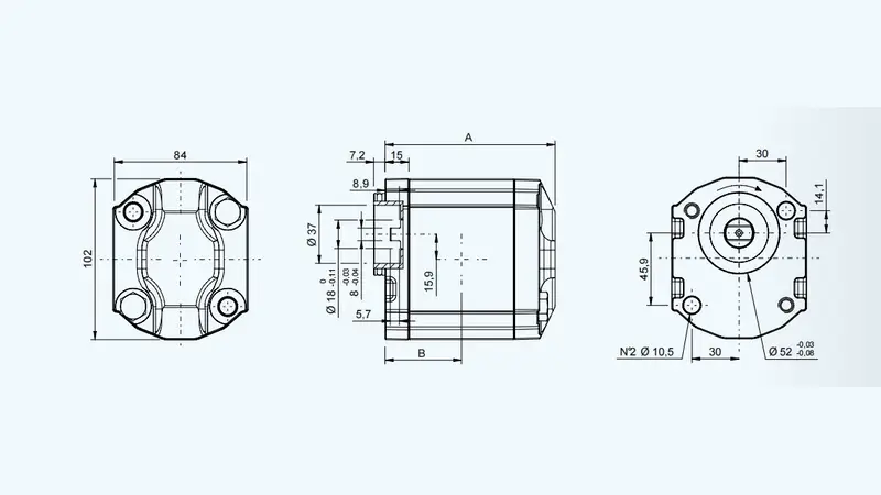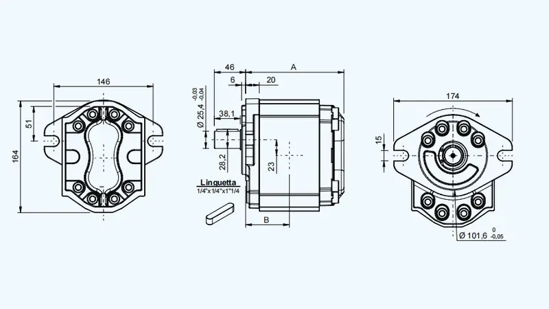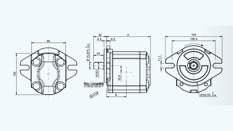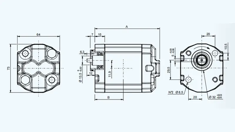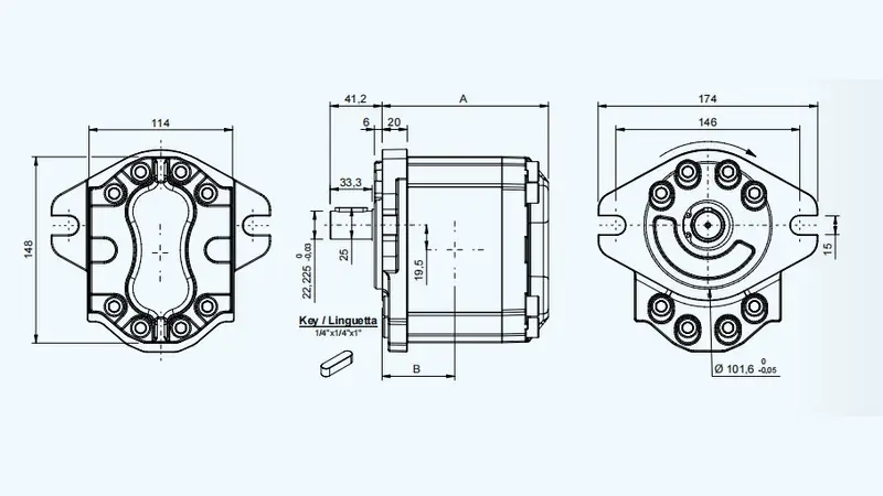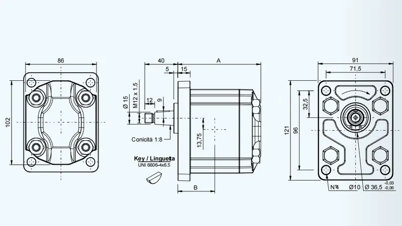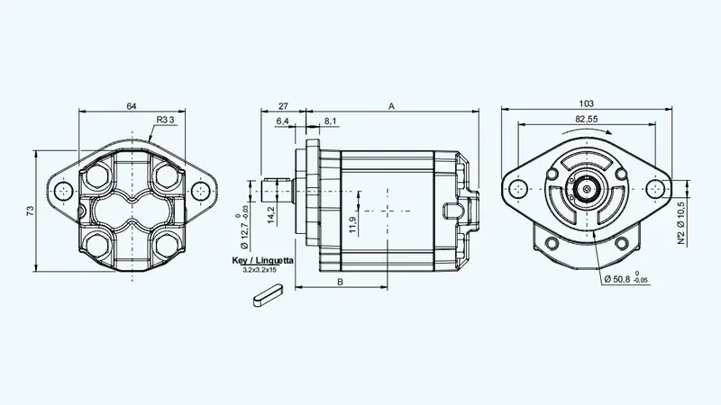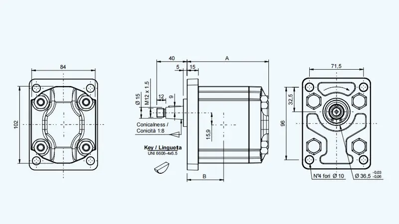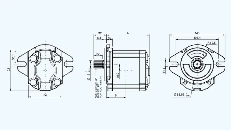 Tipo de brida y eje de transmisión | Desplazamiento (cc/rev) | Flujo (L/min) | Dimensión A (mm) | Dimensión B (mm) | Presión continua (bar) | Presión intermitente (bar) | Presión máxima (bar) | Nivel de ruido (dBA) |