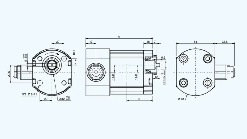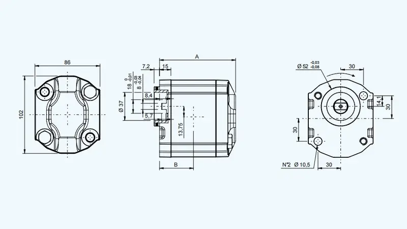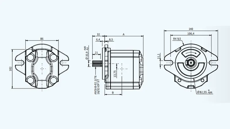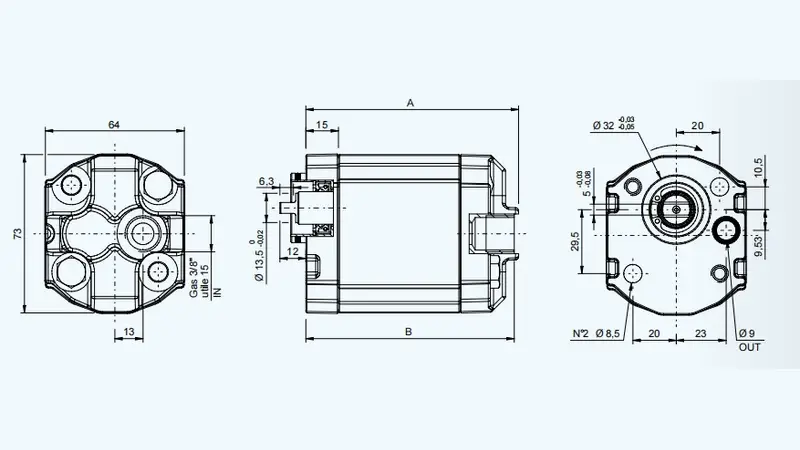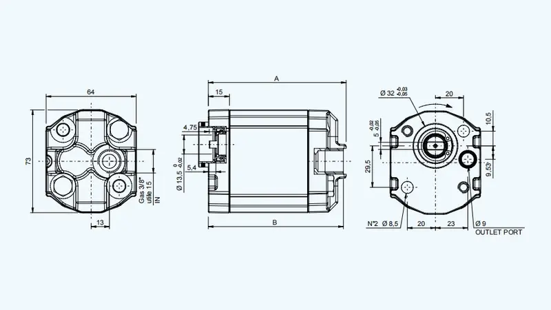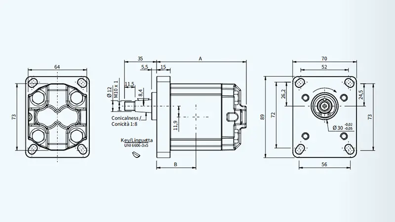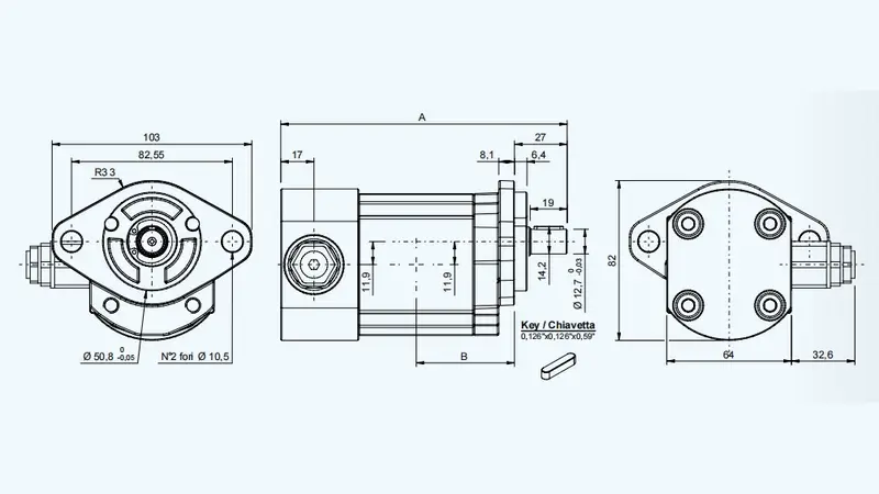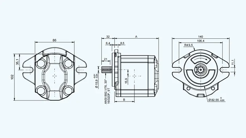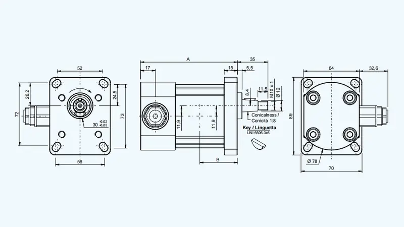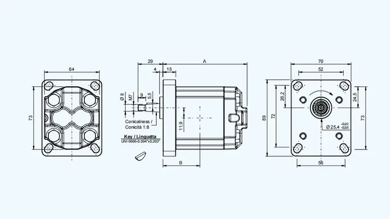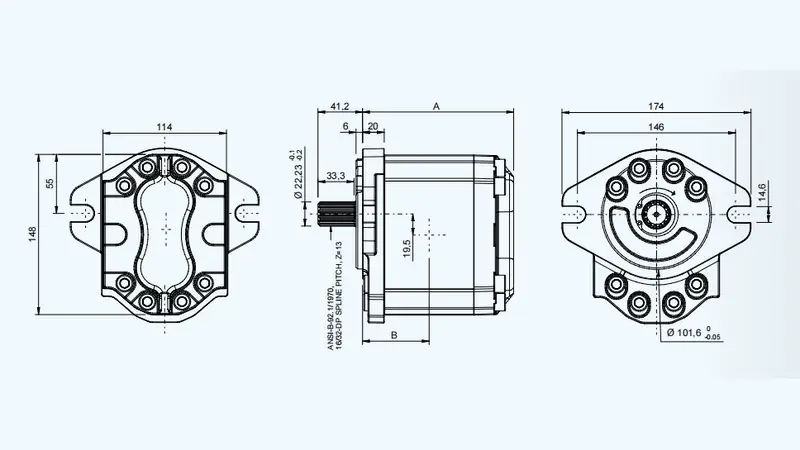 Tipo de brida y eje de transmisión | Desplazamiento (cc/rev) | Flujo (L/min) | Dimensión A (mm) | Dimensión B (mm) | Presión continua (bar) | Presión intermitente (bar) | Presión máxima (bar) | Nivel de ruido (dBA) |