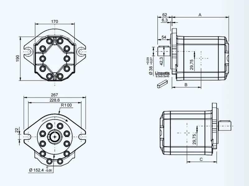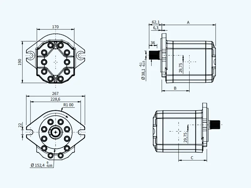 Tipo de brida y eje de transmisión | Desplazamiento (cc/rev) | Flujo (L/min) | Dimensión A (mm) | Dimensión B (mm) | Dimensión C (mm) | Presión continua (bar) | Presión intermitente (bar) | Presión máxima (bar) | Nivel de ruido (dBA) | |